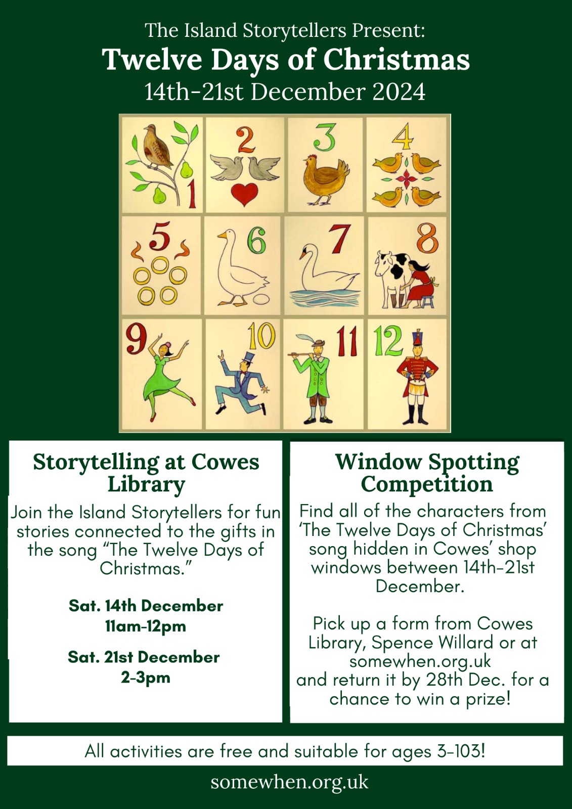 Many people are familiar with ‘The Twelve days of Christmas’, a cumulative song in which more and more gifts are given by ‘my true love’ each time you go round the song, and the basis for a feast of storytelling in Ventnor this Christmas time.