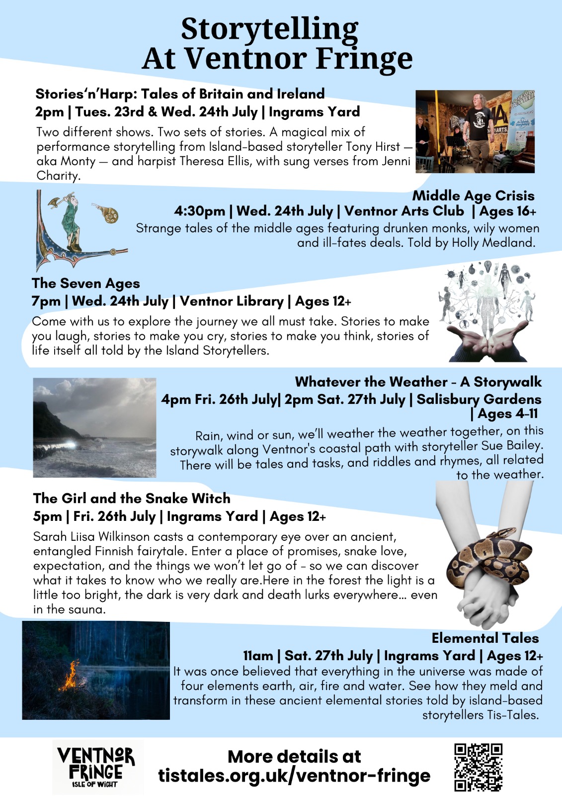 For a second year in a row, we're delighted to be hosting the Somewhen Storyelling Tent at Chale Show, Sat/Sun August 3rd/4th, 2024. Here is the provided schedule formatted into a Markdown table: ### Saturday 3rd August ’24 11-4pm | Time | Storytelling/Activity | Aimed at | Led by | |-------|------------------------------------------------|----------|---------------| | 11:00 | Opening tales - Porridge and pots | All | Sue Bailey | | 11:30 | Musical stories | 3+ | Izzy Norwood | | 12:00 | Monsters and mayhem | 8+ | Nell Phoenix | | 12:30 | Circus skills | All | Alicia Dent | | 1:00 | Kings, coins and Chickens | 5+ | Holly Medland | | 1:30 | Tales from the sea | 4+ | Sue Clark | | 2:00 | Magical Gardens | 4+ | Nell Phoenix | | 2:30 | Musical stories | 3+ | Izzy Norwood | | 3:00 | Circus skills (outside the tent) / Myths and magic transformations (inside tent) | All / 7+ | Alicia Dent / Sylvia Clare | | 3:30 | Stylish Stories | 5+ | Holly Medland | | 4:00 | Closing tales – Beds and Byes | All | Sue Bailey | ### Sunday 4th August ’24 11-4pm | Time | Storytelling/Activity | Aimed at | Led by | |-------|------------------------------------------------|----------|---------------| | 11:00 | Tales from the sea | 4+ | Sue Clark | | 11:30 | Jack the lad’s dreaming | 8+ | Monty Hirst | | 12:00 | Magical gardens | 4+ | Nell Phoenix | | 12:30 | Sing some stories | 3+ | Bev Barber | | 1:00 | Stylish stories | 5+ | Holly Medland | | 1:30 | Porridge and pots | 3+ | Sue Bailey | | 2:00 | Monsters and mayhem | 7+ | Nell Phoenix | | 2:30 | Sing some stories | 3+ | Bev Barber | | 3:00 | King’s chickens and coins | 5+ | Holly Medland | | 3:30 | Island Tales | 8+ | Monty Hirst | | 4:00 | Chillout tales | All | Anyone |Ventnor Fringe 2024 — Storytelling Festival within a Fringe